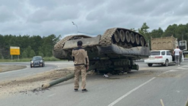 Na Sahalinu tank padel z vlačilca na sredi ceste in se prevrnil (VIDEO)